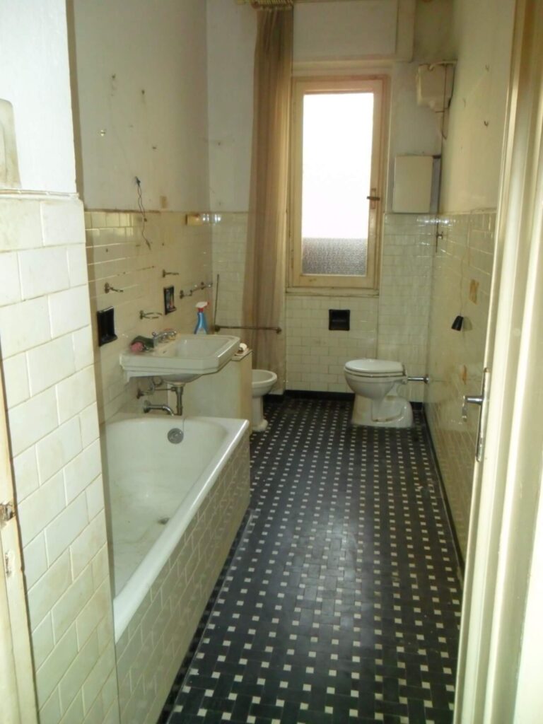 Il bagno caratterizzato da un vecchio rivestimento e una vasca da bagno murata è stato totalmente demolito e rifatto.