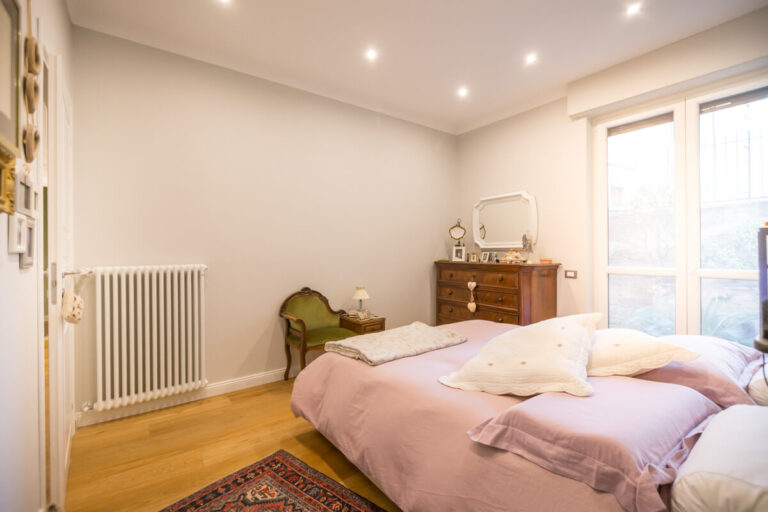 Proseguendo verso il soggiorno, sempre a sinistra si incontra la camera da letto. Essendo un vano molto grande, è stata costruita una tramezza leggera come un setto che oltre a far da testiera al letto, dove è stata ricavata una nicchia/mensola per i libri, ha la funzione di limite che divide la camera da letto da una spaziosa cabina armadio.