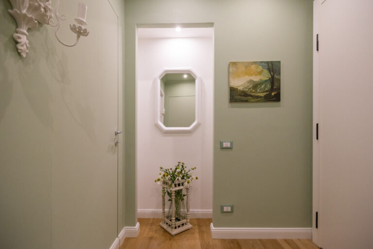 Le cornici presenti nella connessione pareti-soffitto rendono gli ambienti come se fossero delle scatole l’una vicina alle altre; soprattutto nell’ingresso aver dipinto soffitto e pareti con lo stesso colore rende l’ambiente un insieme chiuso accogliente e particolare.