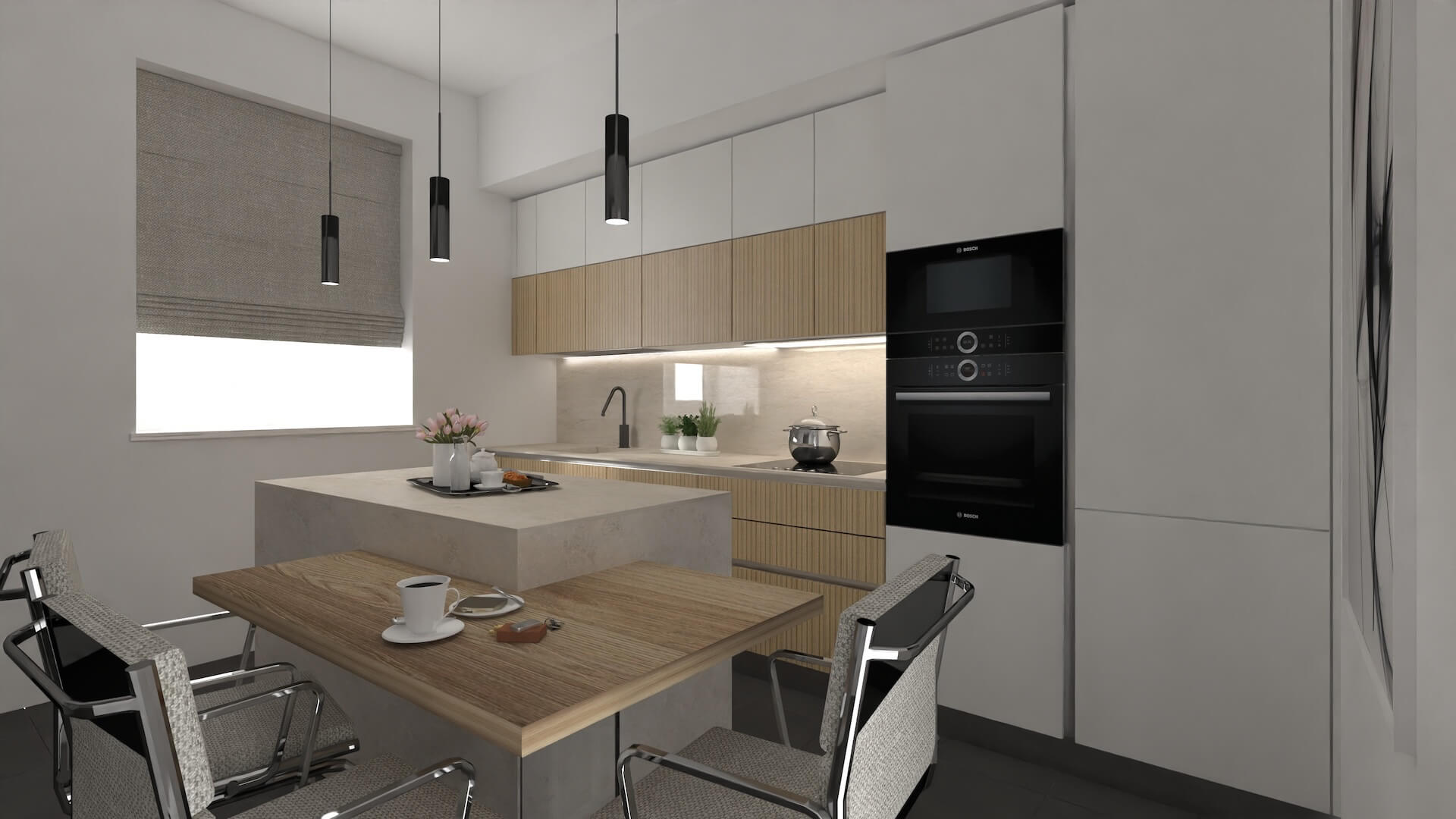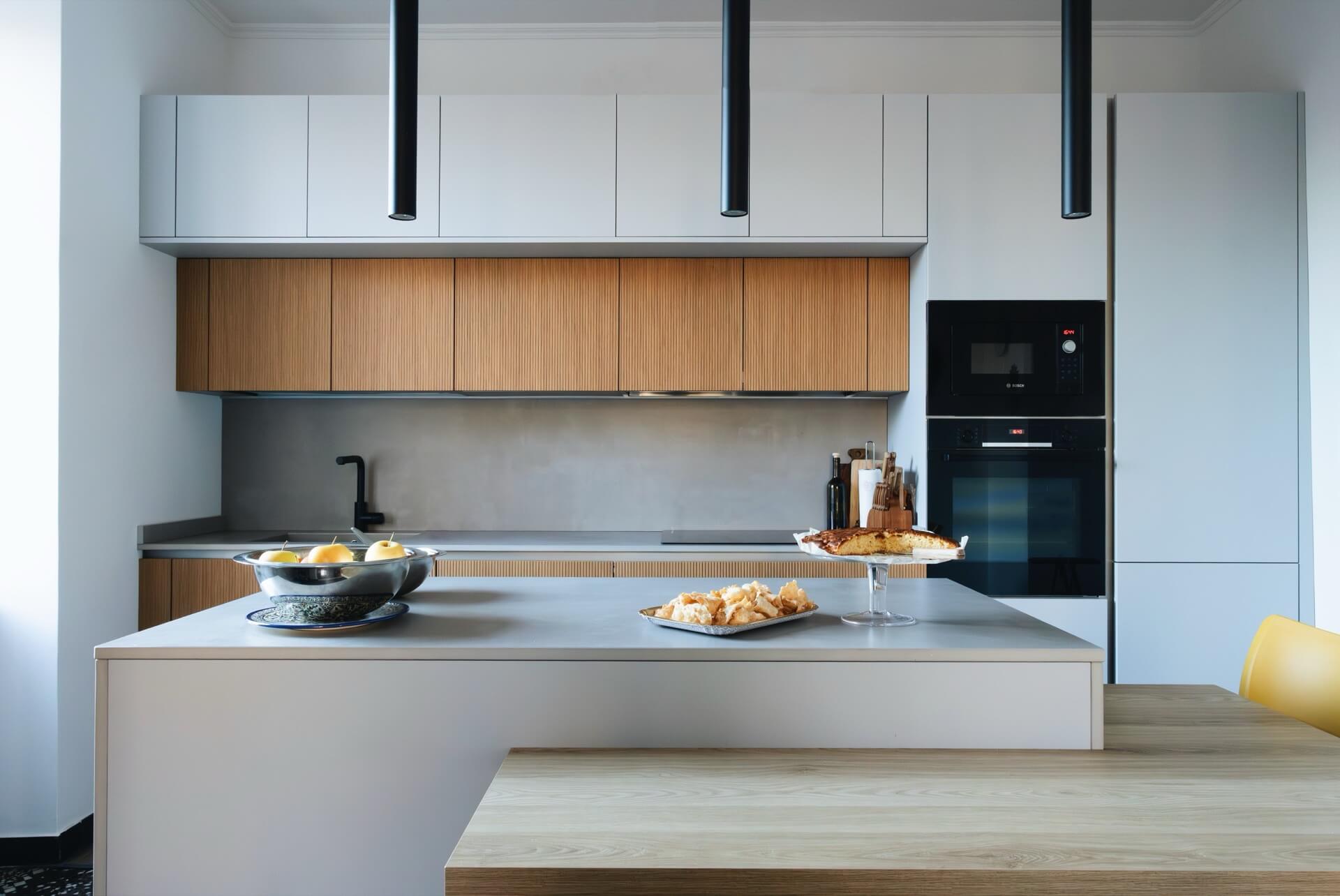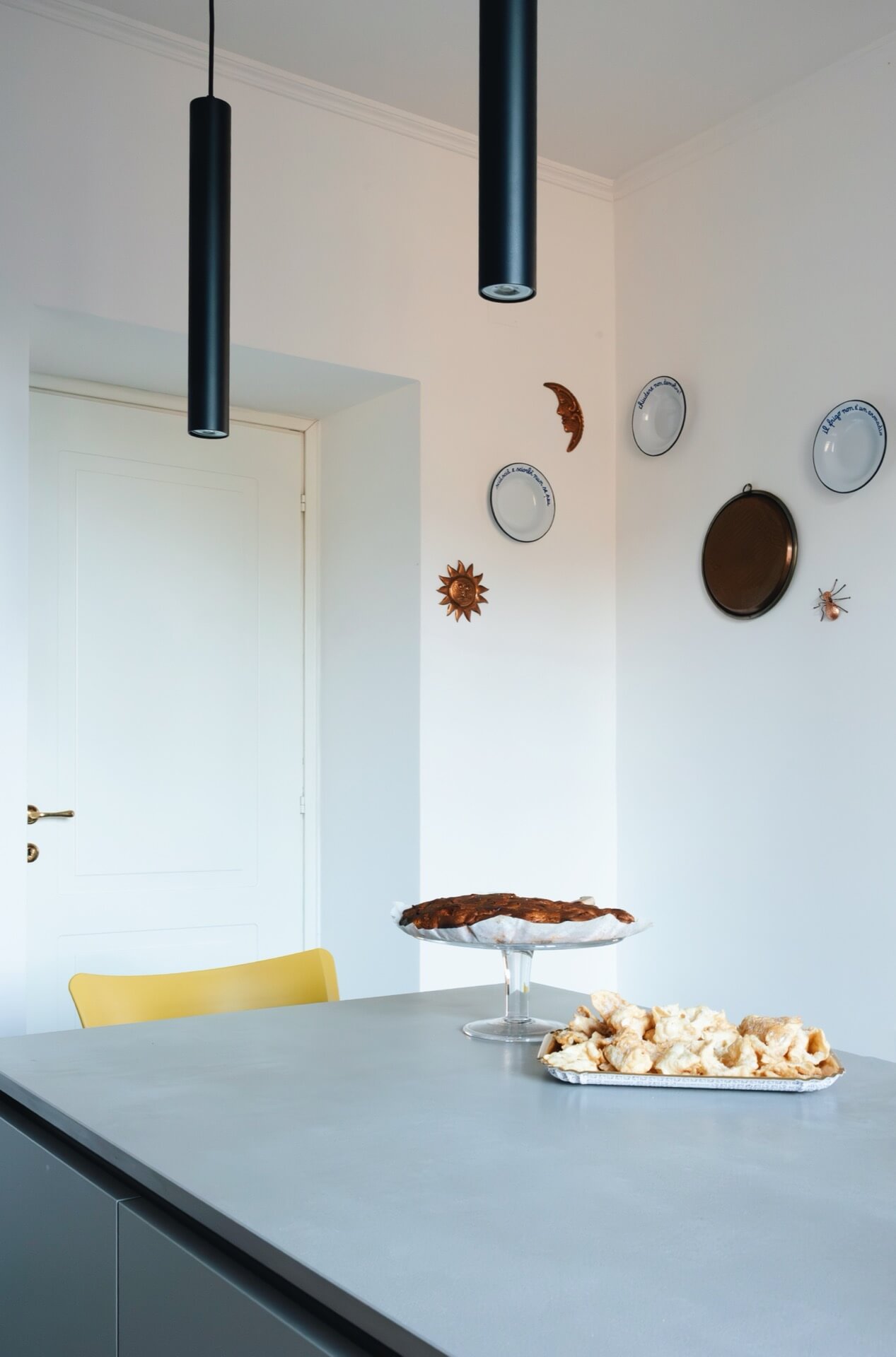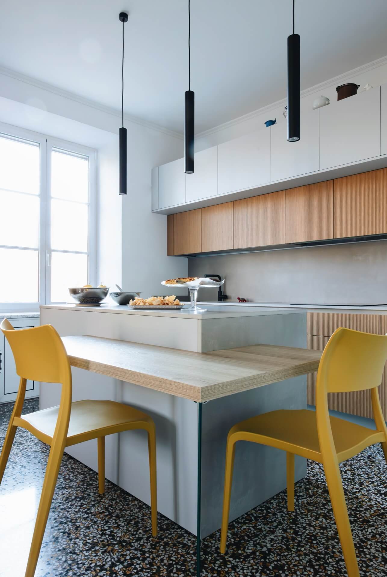 Gli arredi contemporanei — divano grigio, cucina minimale, lampade a sospensione nere — non competono con l’architettura storica: la completano.