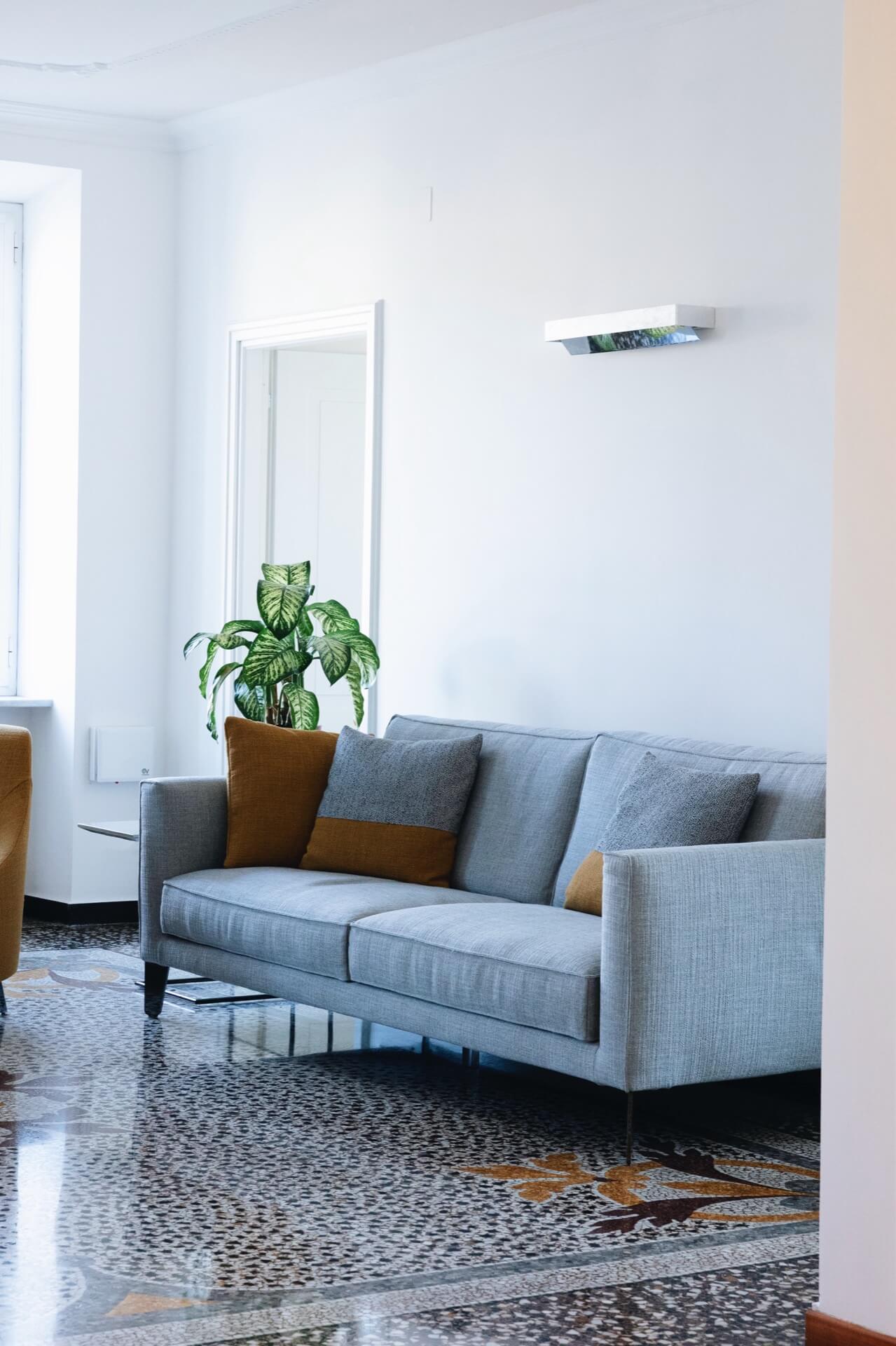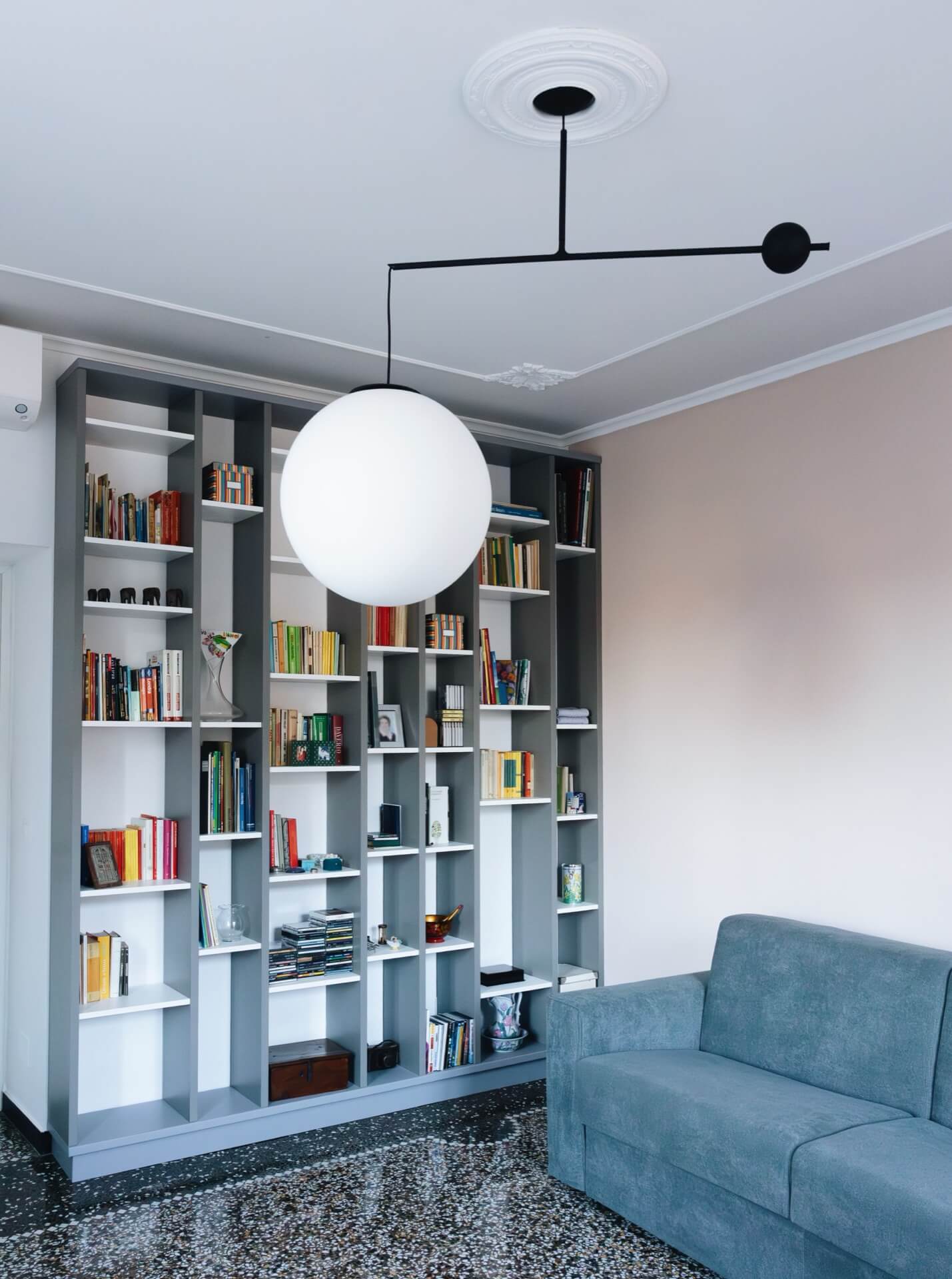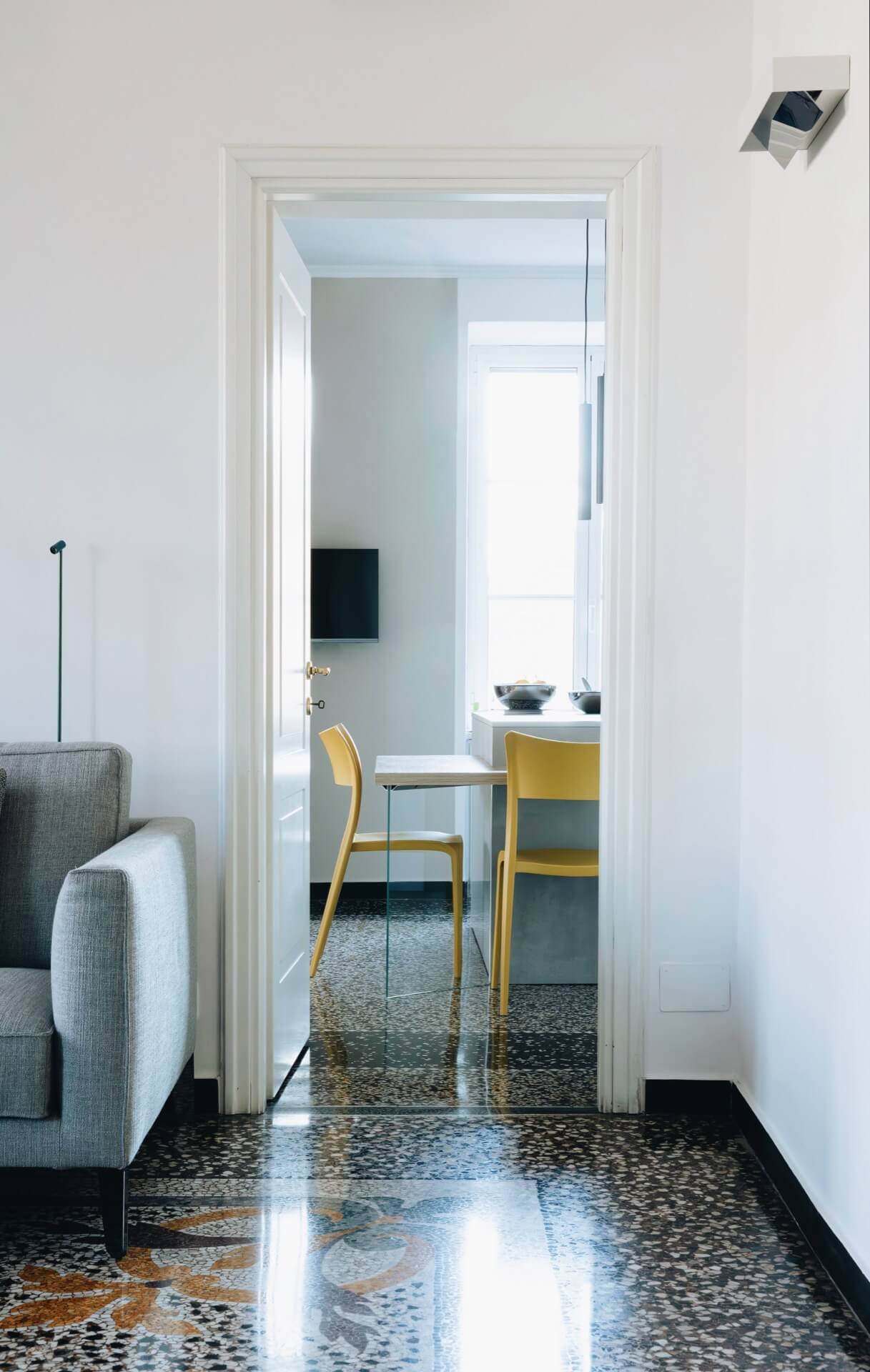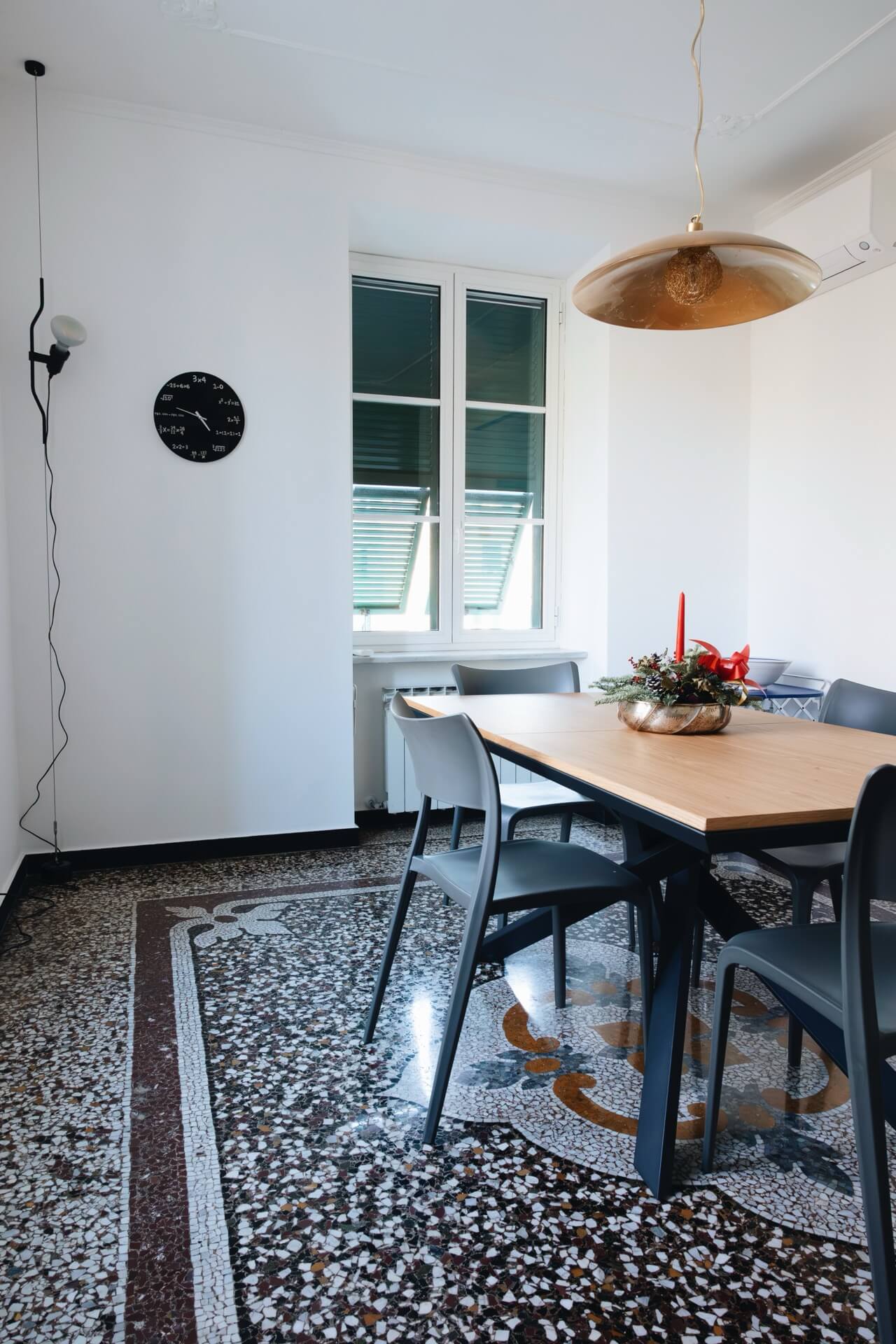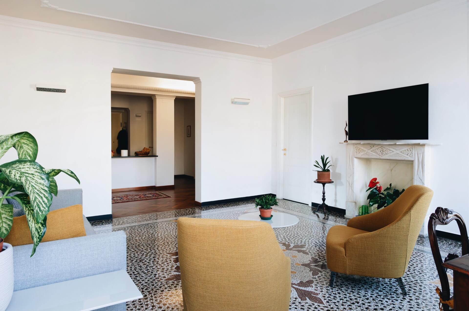 La graniglia, con il suo disegno centrale, non è solo un pavimento: è un elemento compositivo che ha guidato la disposizione degli arredi e l’intero equilibrio del living.