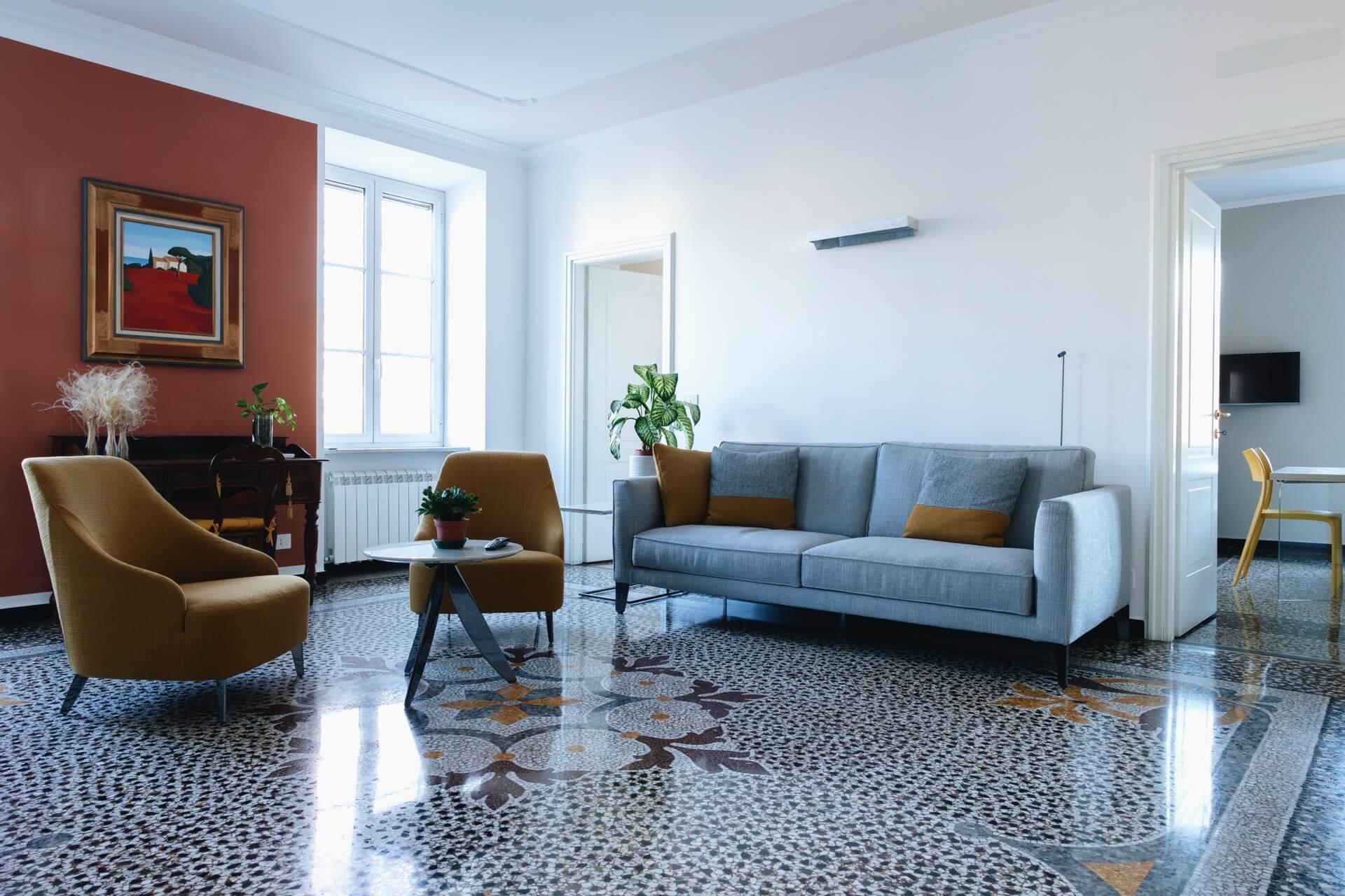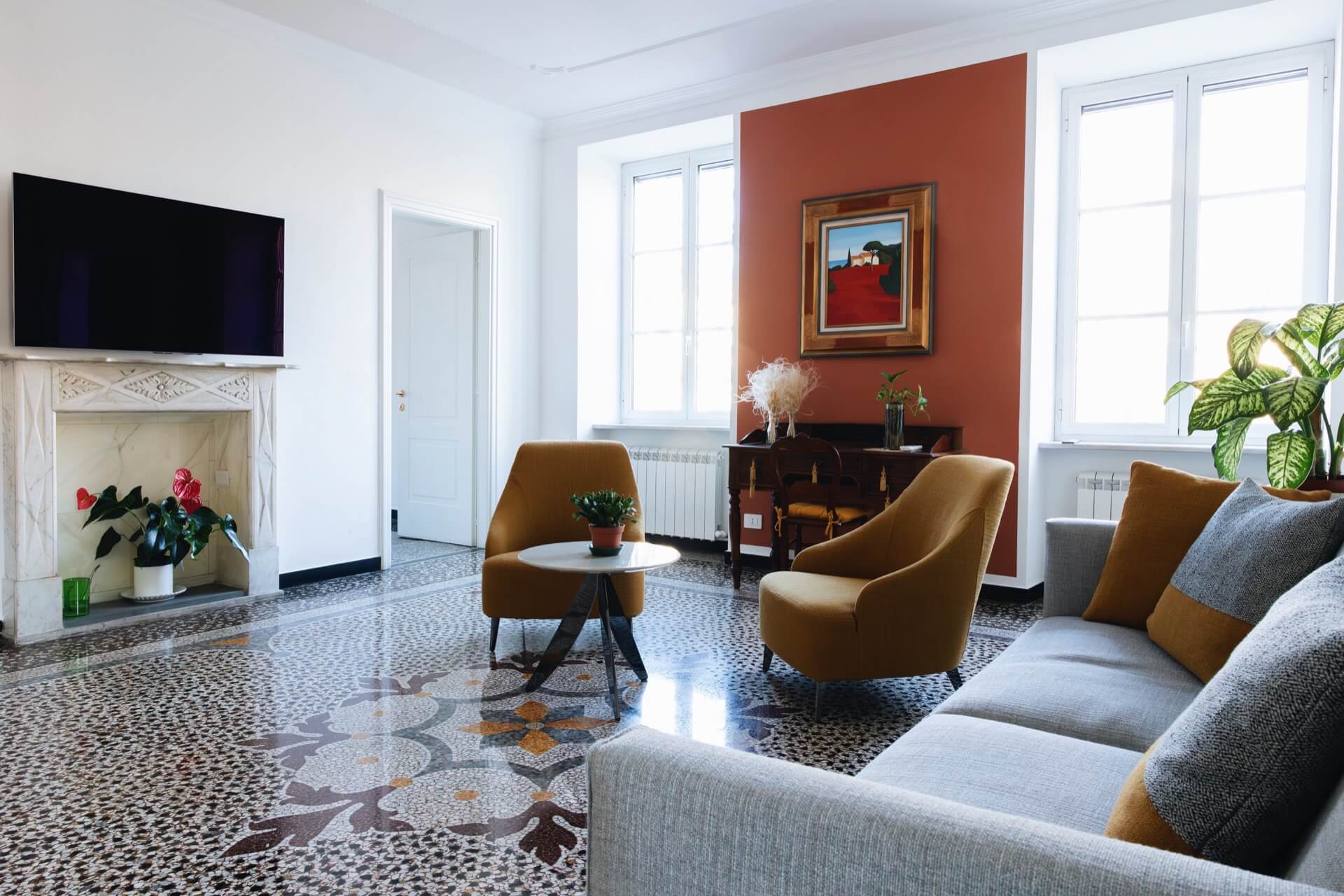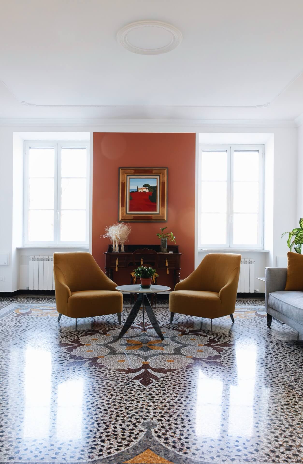 La parete terracotta, inserita tra le due finestre, introduce calore e profondità senza compromettere la luminosità naturale. È una scelta calibrata che dialoga con i toni della graniglia e con le sedute ocra, creando una coerenza cromatica sottile ma potente.