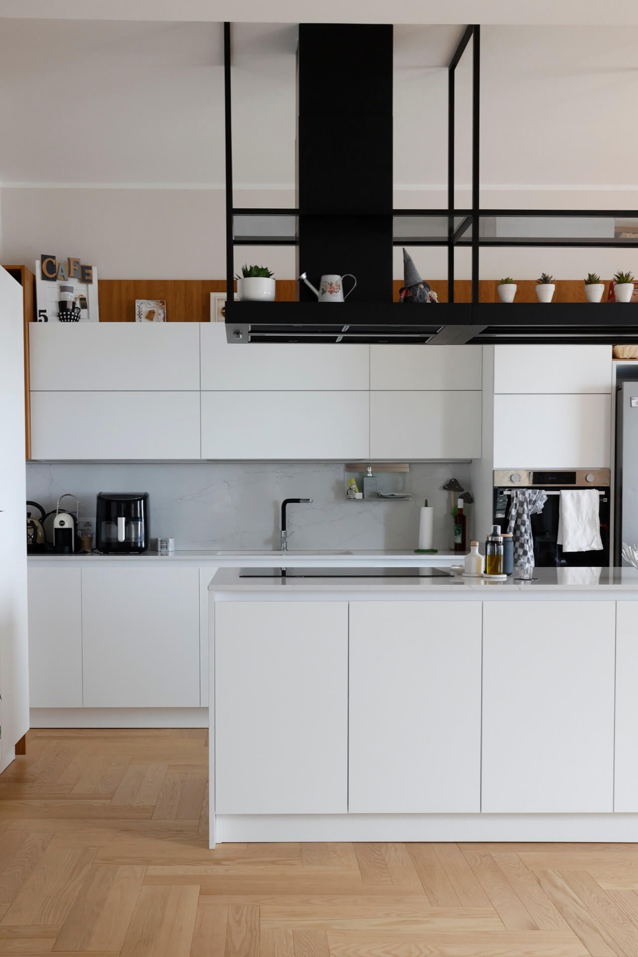 La cucina in connessione con il soggiorno presenta un’isola con tavolo dal sapore un po’ industriale.