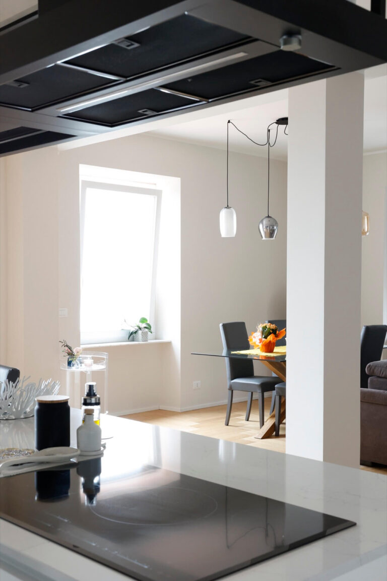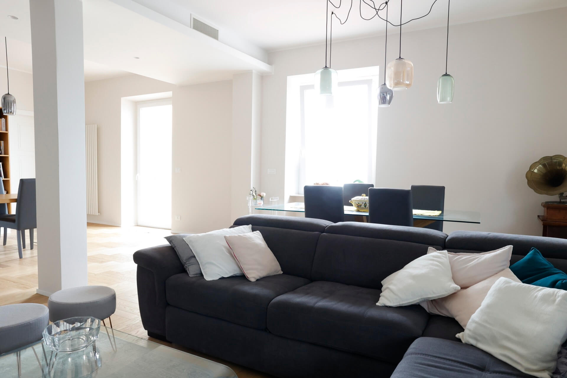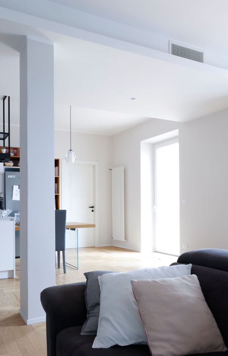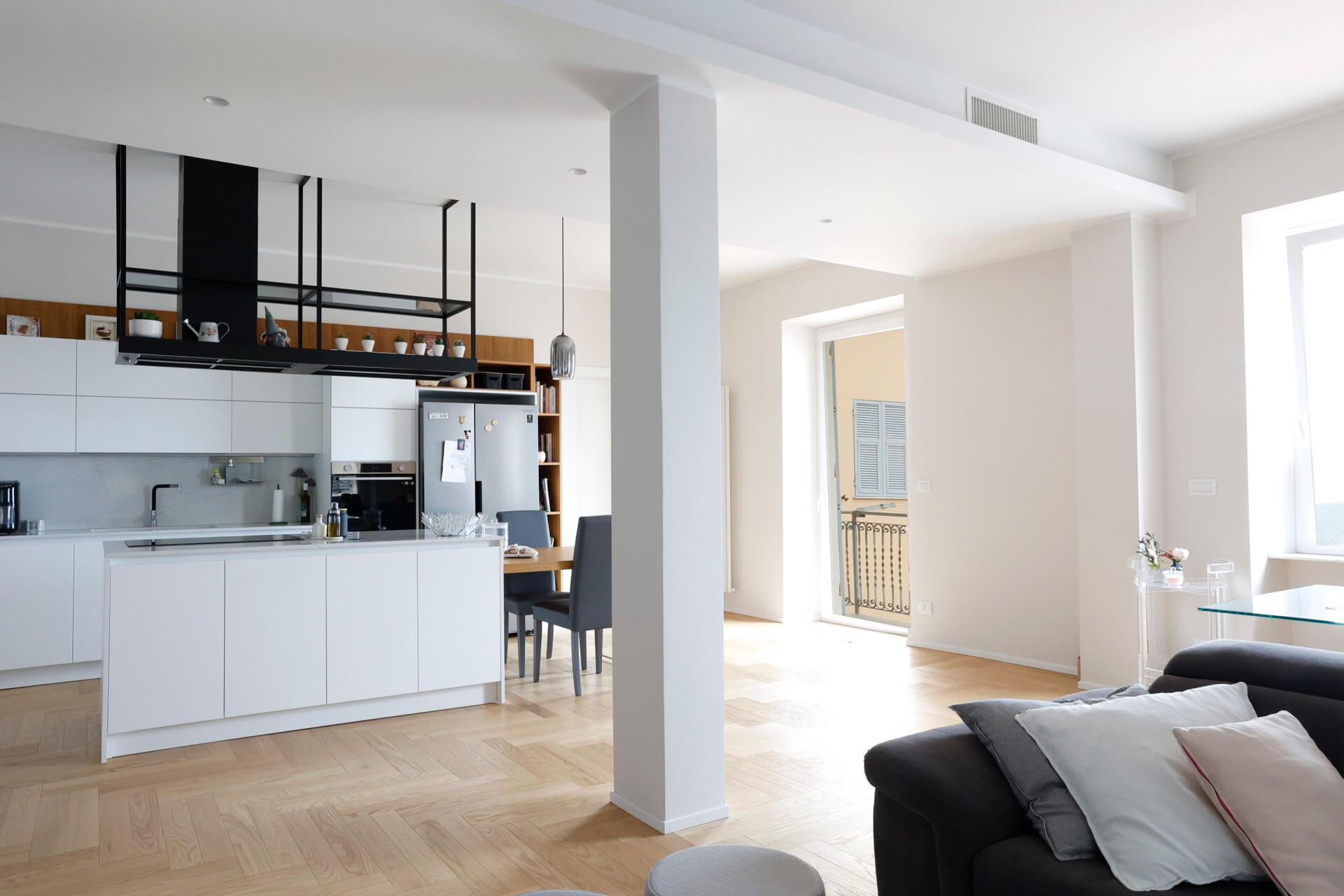 La zona giorno è nata della demolizione di ben 5,4 metri di parete portante e dall’installazione di un doppio portale in acciaio con pilastro formato da 2 putrelle affiancate.